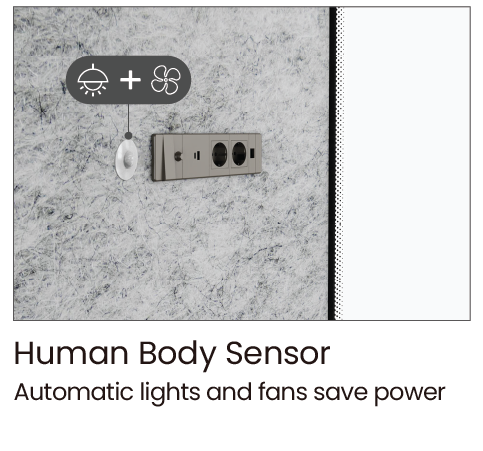 Integrated human body sensor automatically activates LED lighting and ventilation when in use — conserving energy while ensuring comfort. -